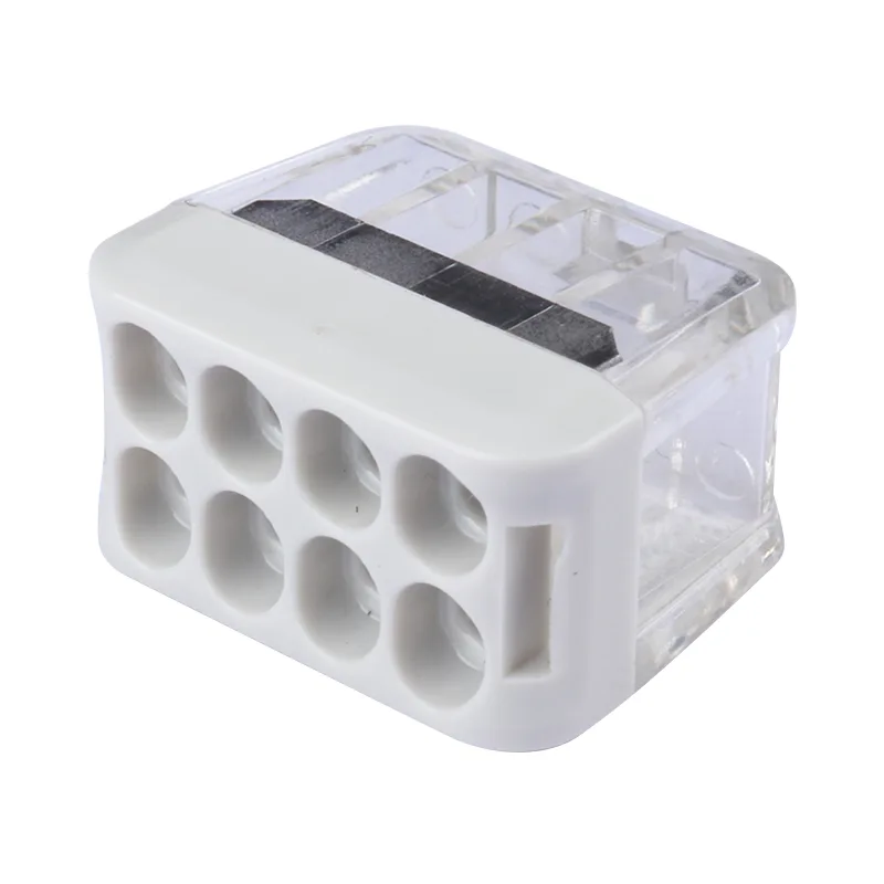 Los conectores rápidos de cable pasante 2P 3P 4P 5P 6P 8P sin palancas se utilizan para iluminación y conexión de cables de enchufe y enchufe. Los conectores de cables rápidos son productos de conexión de cables seguros, cuyo mantenimiento nos permite conectarnos fácilmente para ahorrar tiempo de trabajo y costos de mano de obra.